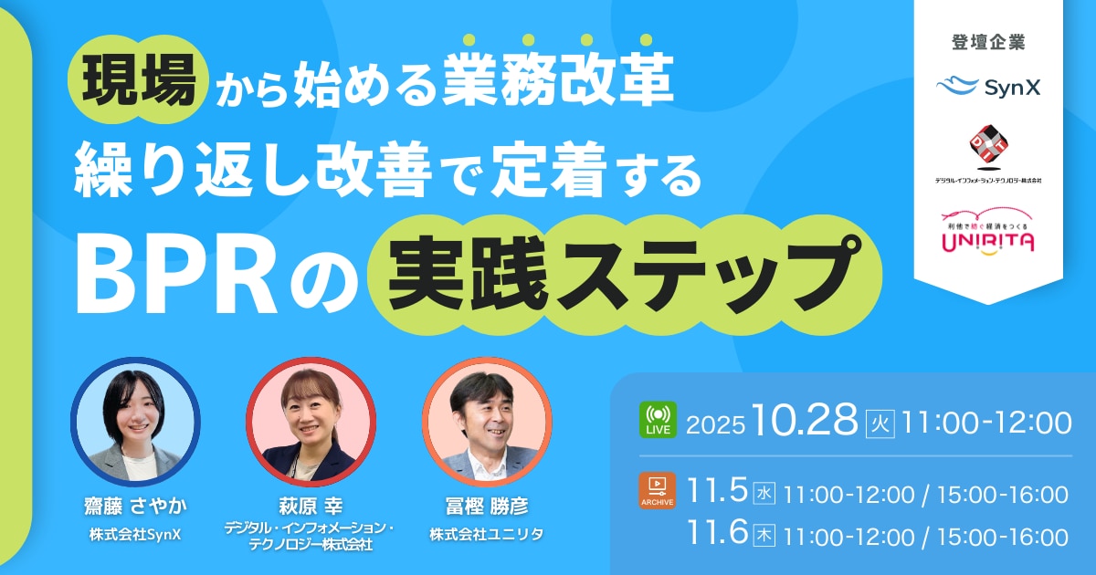 本ウェビナーでは、業務の棚卸しから標準化・自動化、そして継続的な改善まで、 業務改革(BPR)を“継続できる仕組み”にするためのステップを、3社の実例を交えてご紹介します。