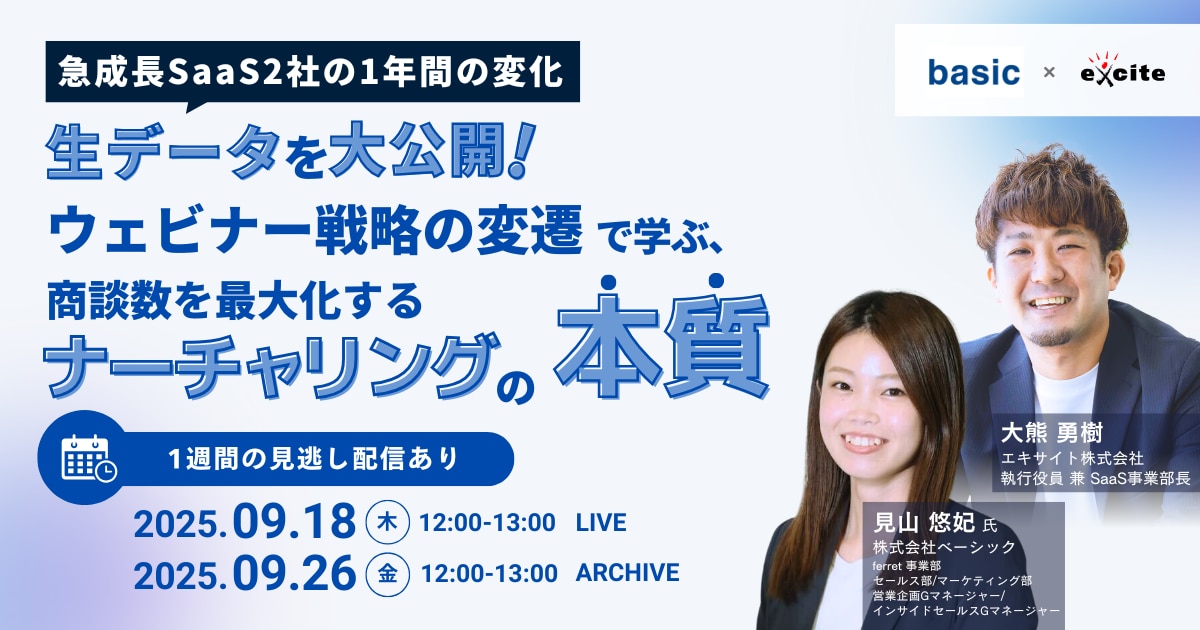 タイトル | 急成長SaaS 2社の1年間の変化を生データで大公開! ウェビナー戦略の変遷で学ぶ、商談数を最大化するリードナーチャリングの本質 |