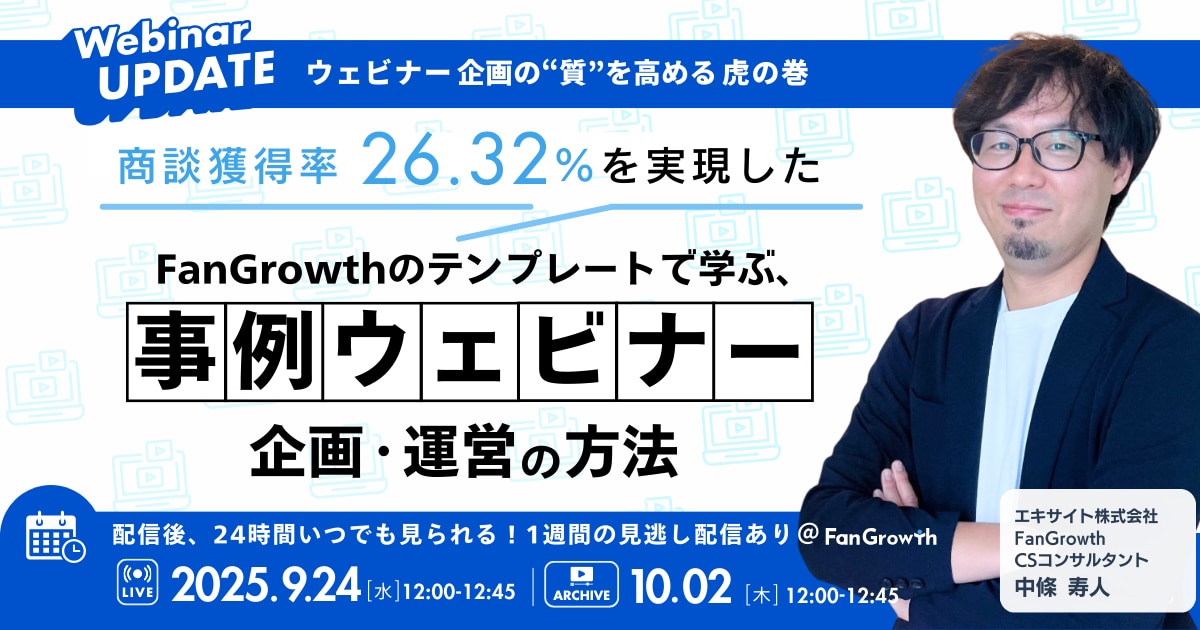 本ウェビナーでは、そんな時代だからこそ有効な「事例ウェビナー」をテーマに、実際に商談化率26.32%を達成した企画・運営のリアルを、実際に登壇したしたFanGrowth CSコンサルタント・中條とマーケが具体的にお話しします。