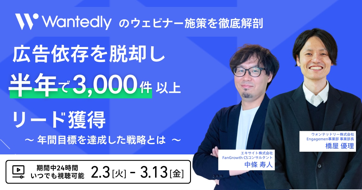 | タイトル | ウォンテッドリーのウェビナー施策を徹底解剖!広告依存を脱却し、3,000件以上のリードを獲得したウェビナー戦略とは |